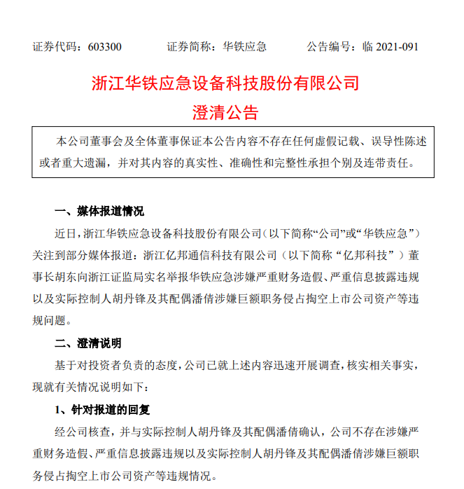 8月8日下午,亿邦国际举行新闻发布会,公司董事长胡东表示,已于上周五(8月6日)向浙江证监局实名举报华铁应急(603300,SH)涉嫌严重财务造假、严重信息披露违规以及实际控制人胡丹峰及其配偶潘倩涉嫌巨额职务侵占掏空上市公司资产等违规问题。