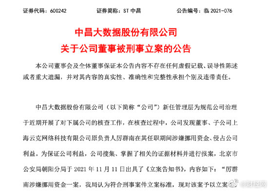 摘要:#上市公司董事长挪用5300万挖矿被抓#【又有A股“董事长”出大事:“80后”前董事长私刻公章,挪用5300多万“挖矿”被逮捕!】前段时间,大家关心的“上市公司董事挪用公司资金购买比特币矿机”的最新进展来了。6月2日晚间,*ST中昌公告称,公司董事厉群南因涉嫌挪用资金被北京市公安局朝阳分局刑事立案后