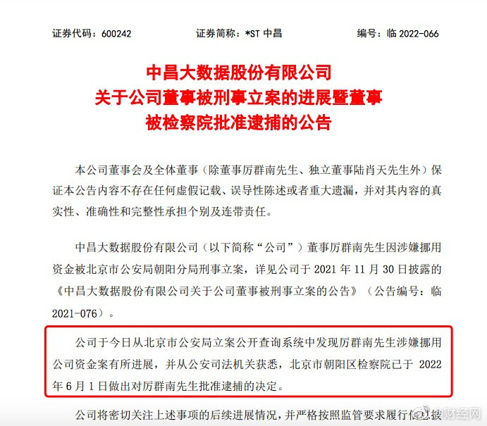 #上市公司董事长挪用5300万挖矿被抓#【又有A股“董事长”出大事:“80后”前董事长私刻公章,挪用5300多万“挖矿”被逮捕!】前段时间,大家关心的“上市公司董事挪用公司资金购买比特币矿机”的最新进展来了。6月2日晚间,*ST中昌公告称,公司董事厉群南因涉嫌挪用资金被北京市公安局朝阳分局刑事立案后,公司从公安司法机关获悉,北京市朝阳区检察院于2022年6月1日做出对厉群南批准逮捕的决定。其中,根据公告披露,公司检查合同发现,2021年1-9月,公司为购买服务器事项而支付的2781.21万元款项,并未在公司账面或实质形成资产。此外,公司为托管费事项而支付的2524.34万元款项,均为托管上述矿机形成的费用,公司为押金事项而支付的49.17万元款项,也为上述矿机托管的押金,总额约为5354.72万元。