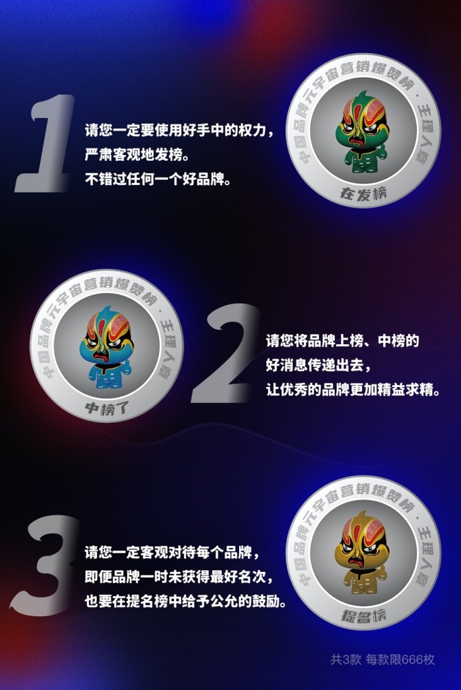 数藏中国CEO王鹏飞表示,元宇宙从2021年走进人们的视野,经过一年来的发展已经深入各个领域。阿迪达斯、李宁、海尔、海信等知名品牌纷纷发布数字藏品,布局元宇宙,元宇宙品牌营销成为数字经济时代新的营销方式。本期数字藏品,旨在推进中国品牌元宇宙营销爆赞榜的顺利开展,推广数字经济时代实体品牌的元宇宙营销方式,引领中国品牌元宇宙营销行业发展。