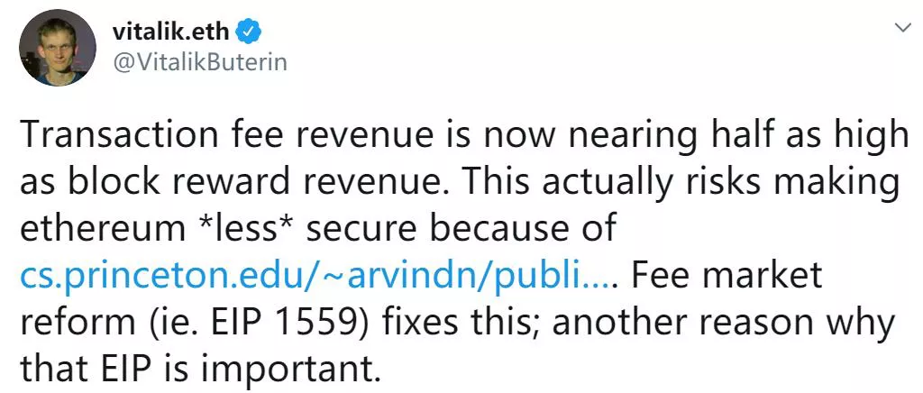 以太坊改进提案 EIP-1559 由 Vitalik 于 2019 年提出的,他发推特称:目前以太坊矿工的收入结构中,交易费收入已接近区块奖励的一半,这可能威胁以太坊的安全性。