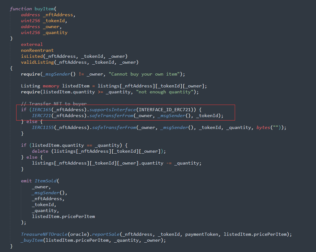 然而在调用buyItem函数时,函数只对购买代币类型进行了判断,并没有对代币数量进行非0判断,导致ERC-721类型的代币可以在无视_quantity数值的情况下直接购买,从而实现了漏洞攻击。