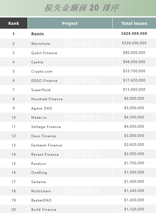 从统计图表可以看到,Ronin和Wormhole两个项目的损失金额达到了9亿5000万美元,占2022年Q1总损失金额的80%。值得注意的是,这两者均为跨链桥类项目。