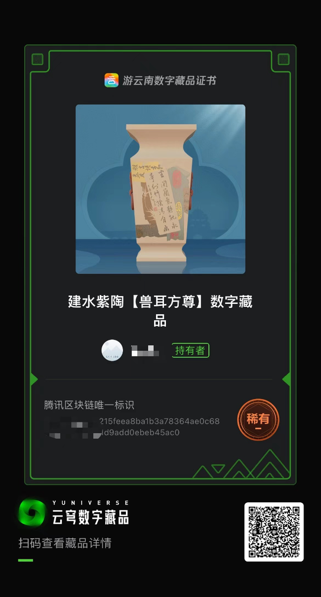 数字藏品是使用区块链技术,对应特定的作品或艺术品生成唯一的数字凭证,在保护其数字版权的基础上,实现真实可信的数字化发行、购买、收藏和使用。此次作为数字藏品发售的国家级非物质文化遗产——建水紫陶代表作“兽耳方尊”,出自云南省工艺美术大师谭知凡先生之手。该款数字藏品运用前沿的3D建模技术,高质量、高精度还原了作品精美的装饰与设计,让收藏者通过手机就能直观欣赏到这款艺术品的细节与精妙,感受大师的匠心与技艺,而区块链技术的加持又让这件数字藏品在网络上具有唯一的身份和稀缺性,极具收藏意义。