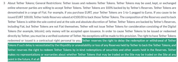 Tether 服务条款:Tether 可以延迟赎回,或赎回证券和其他资产 (非美元)
