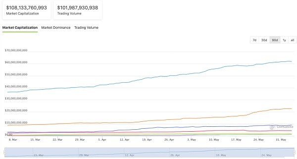 2021 年以来 USDT 的供应量呈现大幅增长。5月末,USDT的总供应量为 632.5 亿,而在 1 月时这个数字还是 216.8亿,不到半年,供应量增长了 2.917 倍。