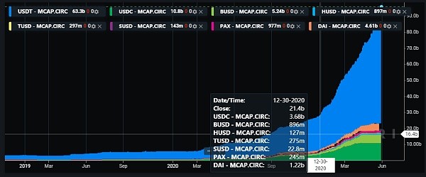但后起之秀的潜力也不容小觑。根据 CoinMarketCap 的数据,USDT 的市值在过去一个月几乎没有变化。与此同时,Tether 最接近的竞争对手 USDC 已经蚕食了稳定通证总市值的 20.96%,较2020年末的市场份额不到 10% 实现了翻倍增长。中心化交易平台 Binance 发行的 BUSD 占 8.19%,加密资产抵押的稳定通证 DAI 占稳定通证总市值的 4.22%。