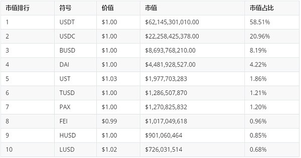 依然是来自 Coingecko 的数据,显示 USDT 在稳定通证总市值中的占比,已经遥遥领先,达到了 58.51%,市值总量是第二名的 USDC 近三倍。