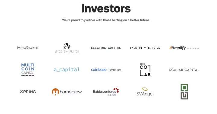MultiCoin Capital,Pantera Capital,Coinbase Ventures,Electric Capital,Hombrew,Amplify,IOSG,Metastable,百度风投,SVAngel,Accomplice等,其中MetaStable是红杉资本、USV、Dragonfly、Protocol Ventures共同投资的加密数字对冲基金。