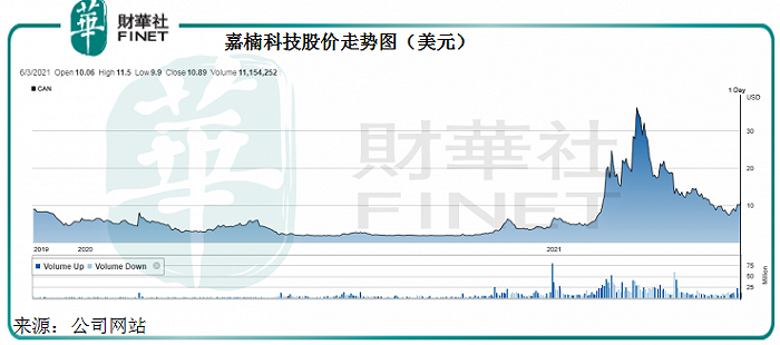 见下图,2019年11月21日在纳斯达克交易所上市的嘉楠科技今年初跟随比特币价格上涨至上市以来的纪录高位39.10美元,较去年年末的5.93美元高出5.59倍。但其后比特币下跌,嘉楠科技的股价也开始回落。