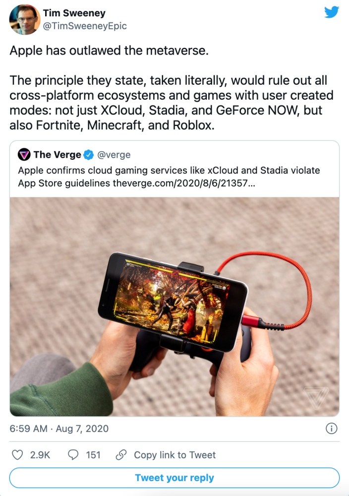 Tim Sweeney 2021 年:「[区块链是]一种无可争议的中立、分布式的表达个人所有权的方式……是走向最终的长期开放框架的最合理的路径,在这个框架中,每个人都能控制自己的存在,不受看门人的限制。」