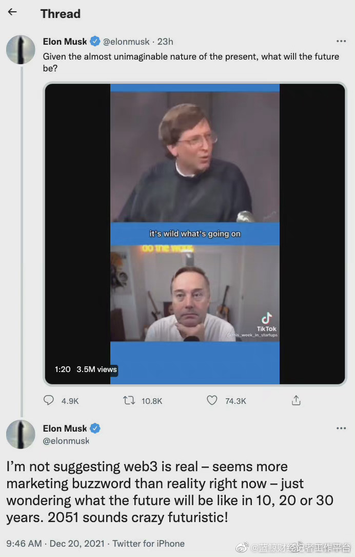 12 月 21 日消息,当地时间周日晚些时候,特斯拉首席执行官埃隆・马斯克(Elon Musk)在个人社交媒体上表示,现在元宇宙现在看起来更像是流行的营销术语,而不是什么现实。“我并不是说 Web3 是真实存在的。在目前看来,Web3 更像是一个营销流行词,而不是什么现实。但可以想象 10 年、20 年或 30 年后的未来会是什么样子。2051 年的未来似乎会很疯狂!”