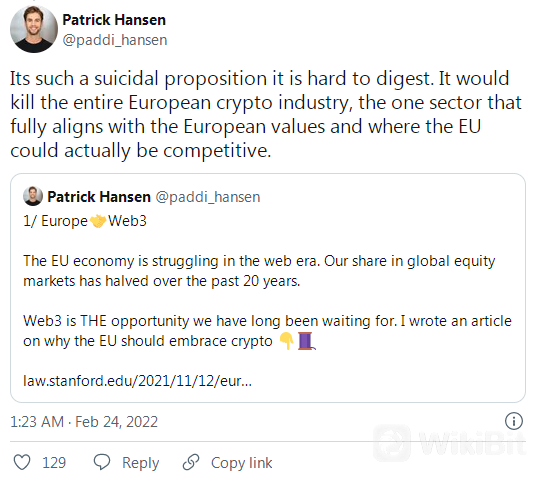去中心化金融初创公司UnstoppableFinance的增长和战略主管帕特里克-汉森(PatrickHansen)将该提议描述为“自杀式行为”,预测它将扼杀欧盟的整个加密货币行业。