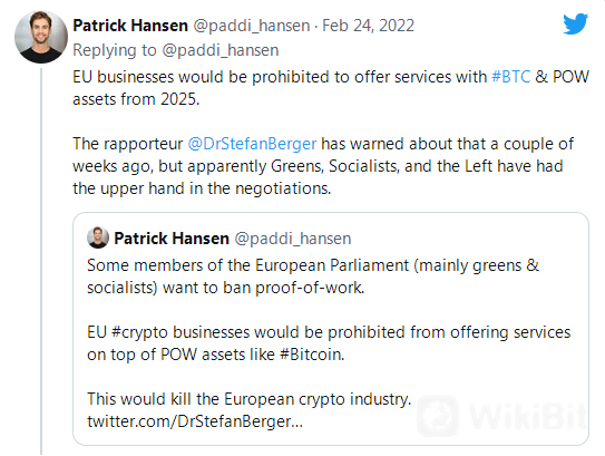 区块天眼APP讯:根据德国加密货币媒体BTC-ECHO发布的一份报告,欧盟立法部门之一的欧洲议会已经采取行动,禁止比特币和其他工作量证明(PoW)加密货币。