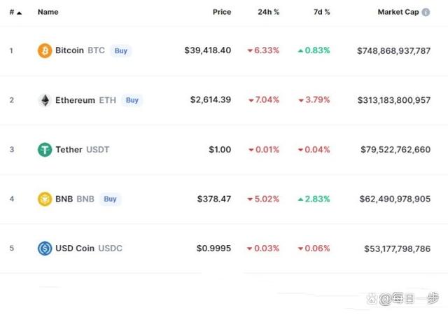 截至5日,比特币在全球硬币行情转播网站coinmarket 3.9418万美元,比24小时前暴跌6.33%。这是自2月28日以来比特币首次跌破4万美元。