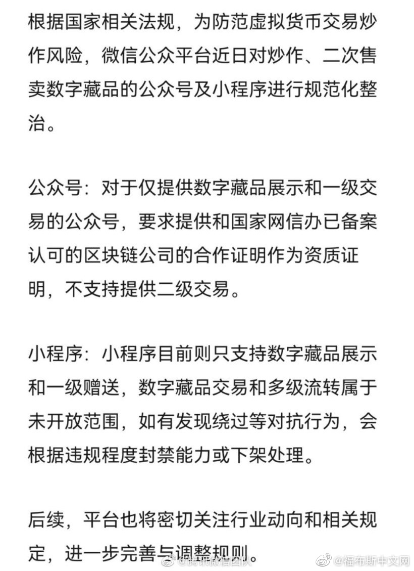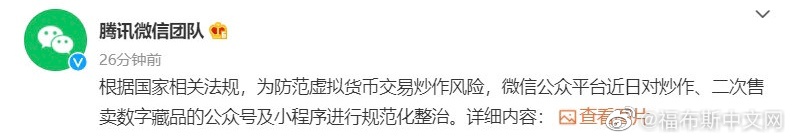 今日晚间,腾讯微信团队官方回应称, 根据国家相关法规,为防范虚拟货币交易炒作风险,微信公众平台近日对炒作、二次售卖数字藏品的公众号及小程序进行规范化整治。#微信回应封禁数字藏品公众号#