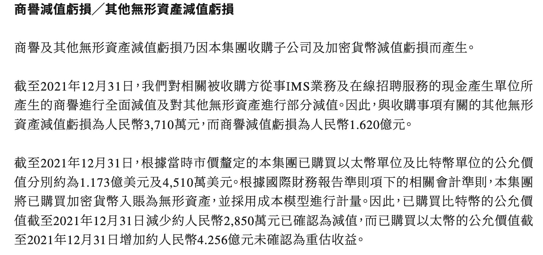 年报提及,商誉及其他无形资产减值亏损是因收购子公司及加密货币减值亏损而产生。其中,收购子公司造成的商誉减值亏损为1.62亿元人民币。