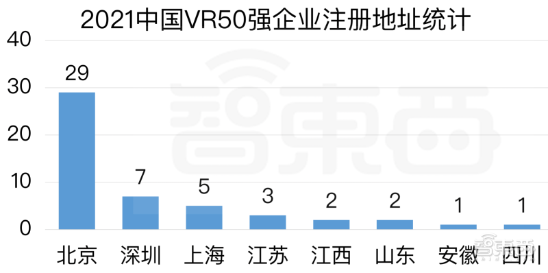 我们分析了2021年中国VR50强企业的公司总部,发现排名靠前的十大VR企业,其中有一半以上的企业总部在北京,分别各有两家在山东和上海,还有一家在安徽。