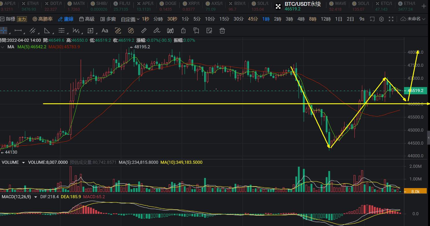 昨天市场再次走出深V反转,比特币以太坊继前面大跌之后,有快速上涨收复失地,盘中以太的涨势惊人,再次刷新了高点,比特币上涨力度稍弱,但也再次站稳了46000关口上方,所以月线收官的下跌终究还是空头力量的过度释放导致的失控,大方向上面还是多头强势当中,小插曲被抚平之后,接下来行情还是回归技术面去运行的概率较大。这个市场就是这样,总会有超出预期的行情走出,但也不会总出意外,超出常理的方向运行还是需要慎重对待,不然昨天为什么老刘我这边一再强调不要追空,上涨趋势当中走出大跌本身就有些意外,那么这种意外很可能就是主力故意为之,所以我们昨天才会在在底部做多,不去追涨杀跌,赚钱都还是次要,最终行情再次回归正轨也算是一个好的信号,起码说明牛还在。