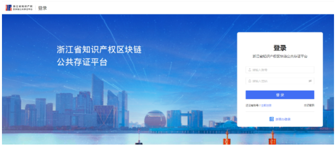 进入“浙江知识产权在线”平台,查找“浙江省知识产权区块链公共存证平台”或输入网址https://www.zjip.org.cn,即可进入登录页面。