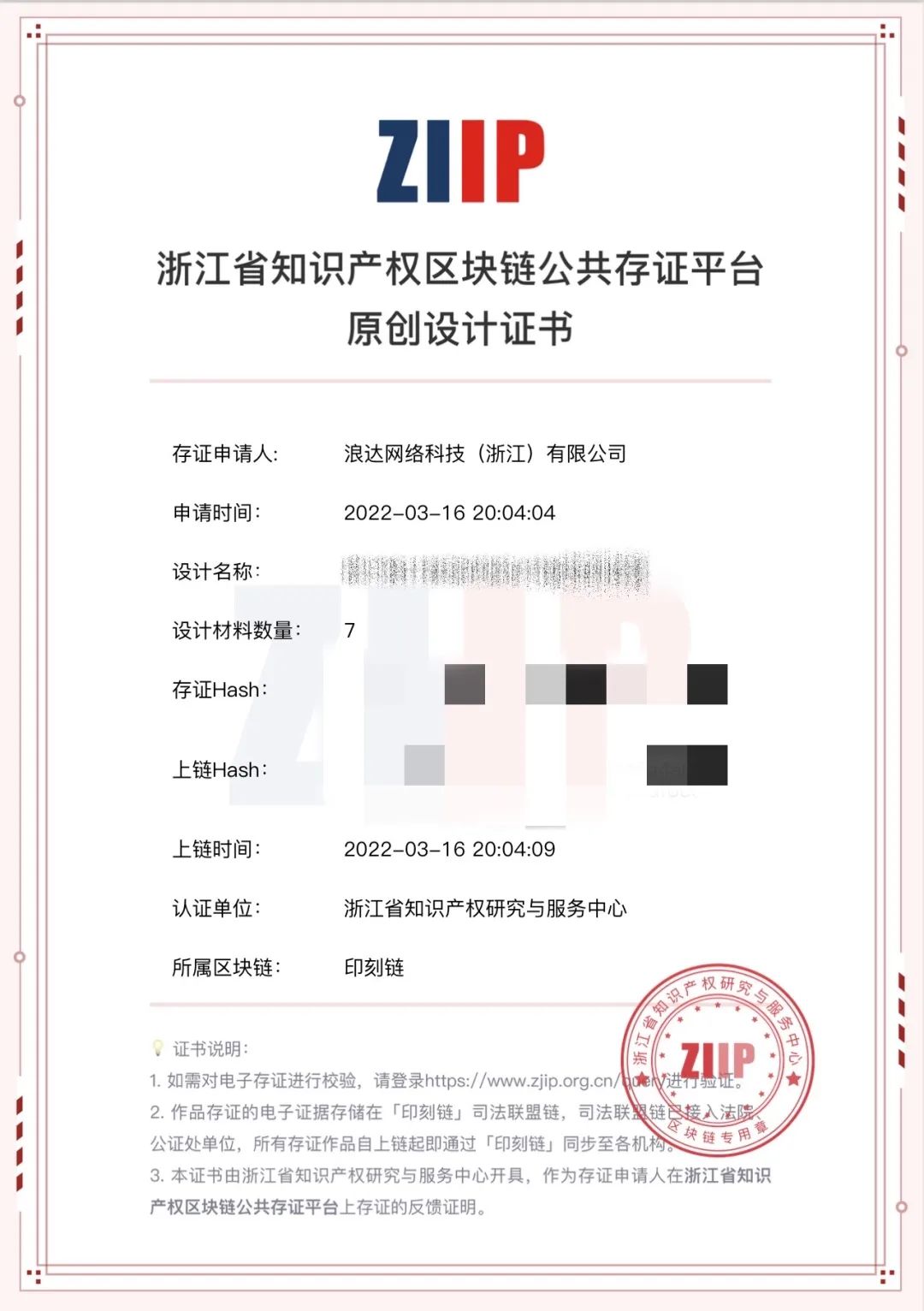中国质量新闻网讯 日前,浪达网络科技(浙江)有限公司的一项节能控制装置设计获得浙江省仙居县首本“浙江省知识产权区块链公共存证平台原创设计证书”,同时也是台州市首批。