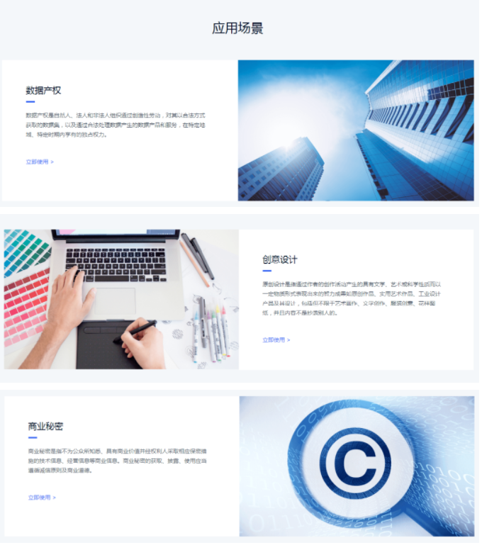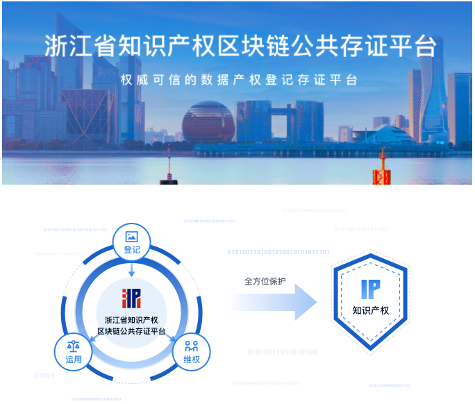 2021年9月9日,浙江省上线了全国首个知识产权区块链公共存证平台——“浙江省知识产权区块链公共存证平台”。平台主要功能为着力加强知识产权保护力度,解决企事业单位知识产权运营及保护的“融资难”“举证难”“成本高”“周期长”等问题。利用区块链技术分布式存储、不可篡改、安全保密及可溯源等特性,为原创设计、数据资产、商业秘密等知识产权提供高效快捷的存证服务,为符合技术规范和安全加密存储要求的存证信息颁发存证证书,并以知识产权区块链存证为基础,为用户在维权、许可、质押、交易等过程中提供相应出证服务,实现知识产权一站式服务。