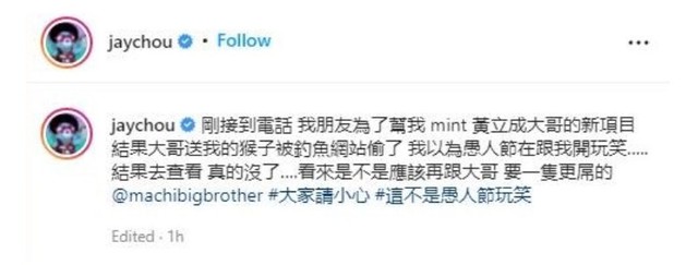 4月2日消息,据了解周杰伦今天表示,由黄立成赠予的无聊猿 BAYC #3738 NFT被人偷了,并强调不是愚人节玩笑,提醒大家注意安全。