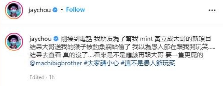 IT之家 4 月 2 日消息,周杰伦在社交媒体上发文确认,曾由黄立成(MachiBigBrother)赠予的无聊猿 BAYC(Bored Ape Yacht Club) #3738 NFT 已被盗,不是愚人节玩笑。