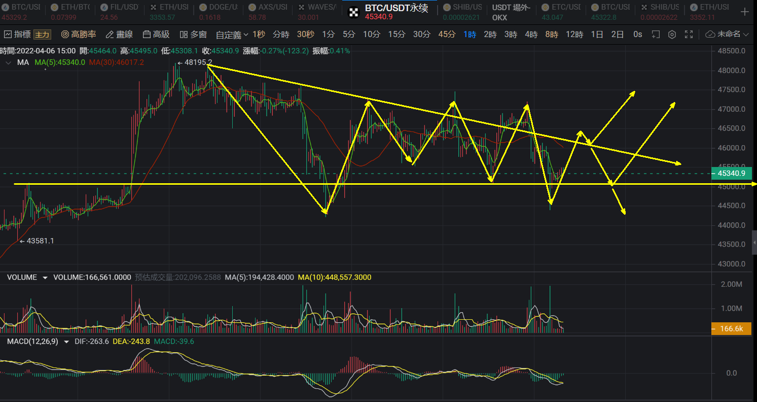首先就大饼来说,45500-46000区间的支撑压力位一直处于互换状态,但是长时间围绕这个区间内上下浮动的过程到目前为止都没有做出明显的放量远离,也就是说短期内市场争夺的多空力量还没有一方取得绝对的优势。因此短期内说市场已经做出方向选择还不够准确,不过随着横盘大区间内行情上下浮动的空间越来越大,确实也该做出一个方向性的突破了。短期内小级别行情运行在一个较为明显的三角区间整盘运行当中,而且也越来越临近了尾声附近,下方45100作为此次三角运行的一个低点水平,上方以高点做一个下行趋势线出来你会发现,行情已经多次走出了刺破反向运行的情况,尤其是昨晚到今天的下跌破位也是一个较为明显的刺破形态。所以接下来行情运行在三角区间内不再跌破45100一线的话,那么就是确认此次下跌是一个虚破下方调整的支撑位,看涨的走势出来,后市行情能快速升破上方的下行趋势线的话,也就是升破46000关口,那就有可能突破了小级别的震荡区间,走出新一轮的上涨,反之不破46000关口的话依然还是小区间三角运行当中,接下来进一步震荡等下一轮行情大概率也就做出方向突破。因此今天日内的思路,还是围绕小级别三角区间去对待,下方回落45100附近可以开始做多,止损400点,目标看46000一线突破情况,46000不破的话等行情继续回落看能否再次企稳在45100一线。因为就日线来看上方也是一个较为明显的虚破支撑反看涨的走势,大趋势还是多头占优,短期内我这边还是不考虑去做空。哪怕昨天这么大幅度的下跌依然不变。