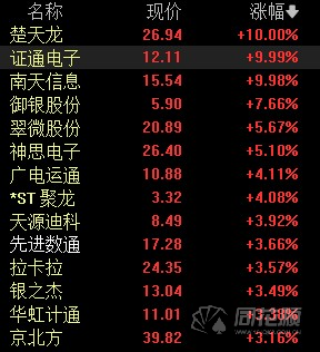 4月6日,受利好消息刺激,数字货币板块大涨,截至发稿,楚天龙(003040)、证通电子(002197)、南天信息(000948)涨停,御银股份(002177)、翠微股份(603123)等多只个股纷纷跟涨。