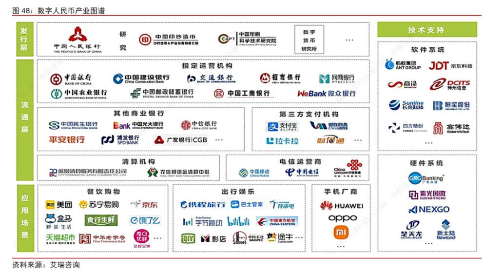 (2)平安证券指出,软件厂商或将受益于金融系统升级带来的业务增长。伴随着数字人民币的普及,相关金融机构需要对相关软件系统进行匹配性升级,或将为相关软件厂商带来系统升级的巨大需求。相关公司包括,长亮科技(300348)、神州信息(000555)、天阳科技(300872)、京北方(002987)、高伟达(300465)。