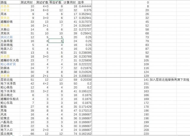 1. 我觉得新手的上手难度是衡量联机路线图的重要指标,其中很重要的一点是用稍长的路线取代零散的小路线,这样新人不容易在反复传送中落队以至于手忙脚乱。在原帖的计算中使用的是跑路时间+传送8s进行估计,而在本次计算中,我对跑路时间额外做出限制,低于8s跑路时间的都取8s,由此模拟新人勉强跟上时传送稍慢一步的情况。也是因为这个算法,我的效率表中与原表最大的差距就在于踏鞴砂东部的船点,那里是典型的路途短(几乎不用动)收益小(只有3块)路线,在我这次更新中被舍弃了。