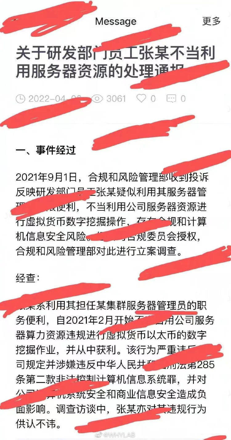 记者留意到,对上述传言,有网友放出公司内部网站截图,称蔚来已对该名研发部门员工进行通报处理,经查,该员工自去年2月开始,利用公司服务器算力资源违规进行虚拟货币以太币的数字挖掘作业,并从中获利。在调查中,张某对于自己的违规行为供认不讳。