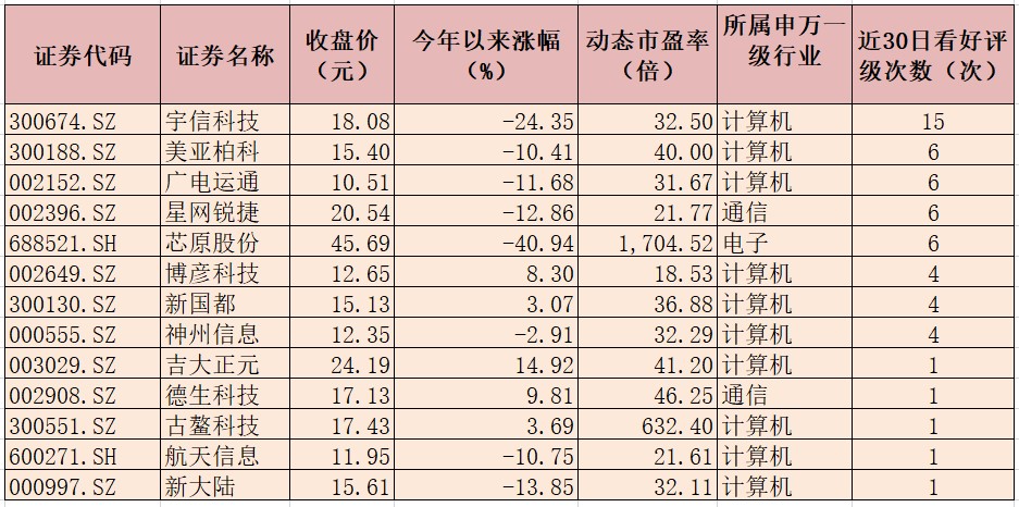 最近30日内,有13只数字货币概念股获机构给予“买入”或“增持”等看好评级,其中,有5只个股获机构高频点赞,宇信科技获得看好评级次数最多,为15次,美亚柏科、广电运通、星网锐捷、芯原股份等4只个股获得看好评级次数均为6次。