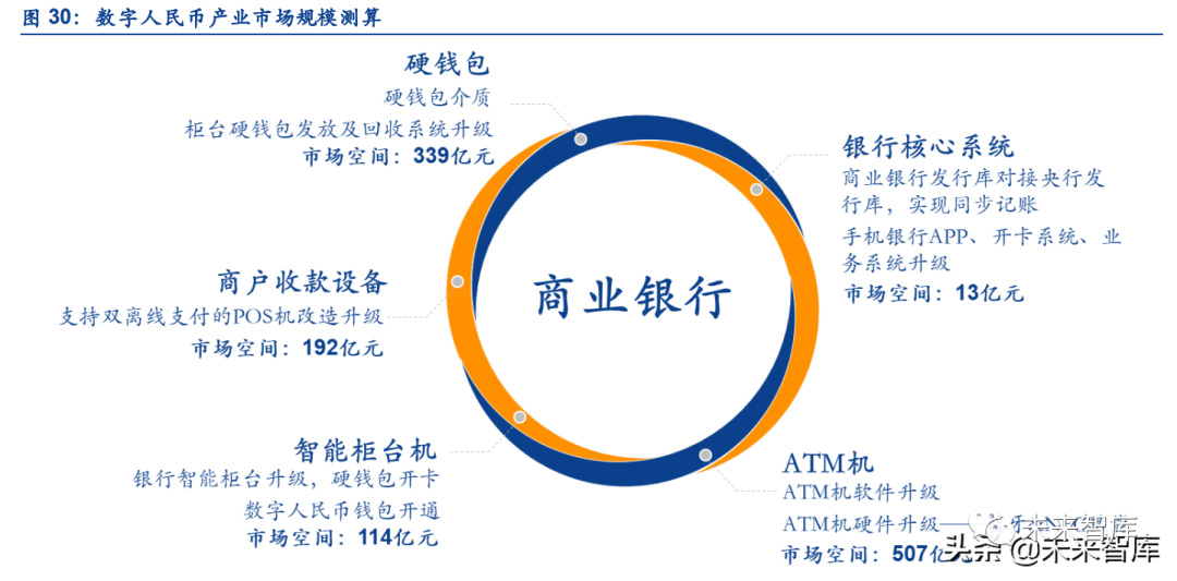 ATM 机、智能柜台机、POS 机改造:合计 813 亿市场规模。我们认为数字人民币的建设需 要进行 ATM 机和银行智能柜台机的改造。其中,ATM 机改造主要涉及纸币、存款与数字人 民币的互换设备和相关系统。智能柜台机主要涉及硬件包的申请和发放,以及与数字人民币 系统的对接。