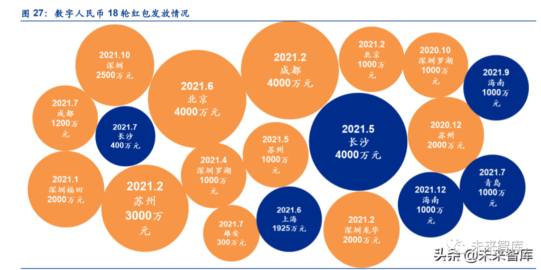 红包发放来看,目前十大试点城市已经先后发放了 18 轮红包,金额从几百万到上千万不等。我们认为数字人民币红包的发放,有利于数字人民币在社会上的普及和流通,未来这种促进 和优惠仍有望持续落地。