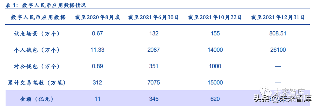 随后,在 2022 年 1 月 18 日的国新办新闻发布会上,央行金融市场司司长邹澜介绍,“截至 2021 年 12 月 31 日,数字人民币试点场景已超过 808.51 万个,累计开立个人钱包 2.61 亿 个,交易金额 875.65 亿元”。我们认为,数字人民币当前无论从试点的场景商户数、个人钱包和对公钱包的开立、累积交 易笔数以及累积交易金额来看,都呈现出快速提升的趋势。