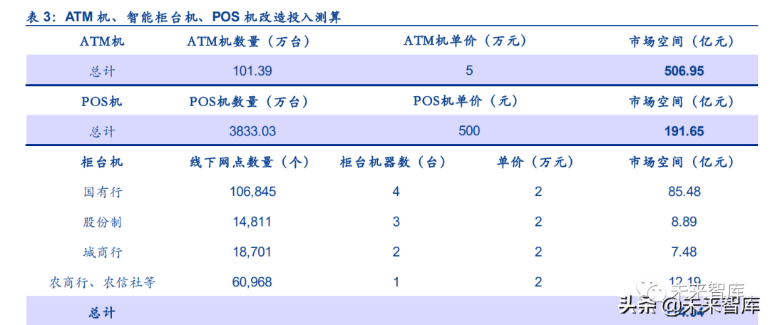 ATM 机改造:根据央行发布的《2020 年支付体系运行总体情况》,2020 年末全国 ATM 数量 为 101.39 万台。根据《莱芜农商银行新型存取款一体机招标项目》的公告,存取款一体 ATM 机的采购价为 51600 元,我们假设单台 ATM 改造均价为 5 万元,则对应 507 亿的市场规模。