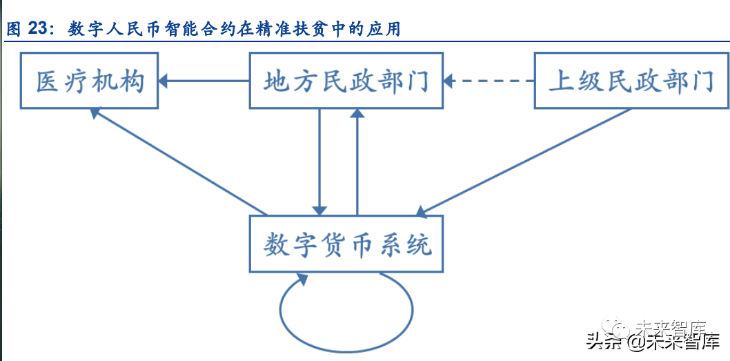 上级民政部门可以通过数字人民币进行扶贫资金拨款,根据扶贫资金使用的要求(如进行医 疗救助)来设定支付合约,支付合约由数字货币系统自动化执行,数字货币只能按照支付合 约指定的用途规则限定的资金通道进出。