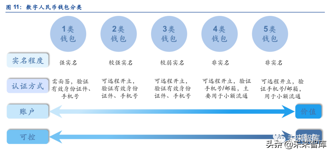 数字人民币通过钱包分类实现“小额匿名、大额可控”。数字人民币钱包采用了分级分类的 设计,根据 KYC 程度的不同开立不同级别的数字钱包,满足公众不同支付需求。其中 KYC 强度最弱的钱包为匿名钱包,仅用手机号就可以开立,这类钱包的余额和每日交易限额也最 低,只能满足日常小额支付需求。如果要进行大额支付,就需要升级钱包,钱包余额和支付 限额会随着 KYC 强度的增强而提高。