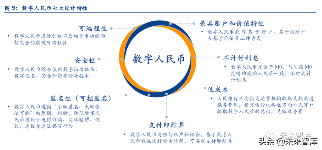 数字人民币具有七大设计特性。数字人民币在设计 时具有七大特性,其中,我们认为可控匿名、支付即结算、可编程性是数字人民币区别于传 统纸币以及其他移动支付工具的主要特点。这三大技术有望打造数字人民币新的应用场景。
