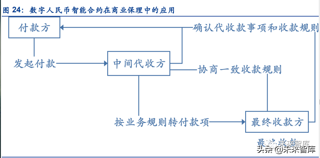 数字人民币通过智能合约,可以实现保理业务等类似业务中,无需引入第三方参与,也无需 新开立监管账户,从而有助于解决付款方到最终收款方中间存在一个或多个代收方从而带来 的信用风险、操作风险等问题。