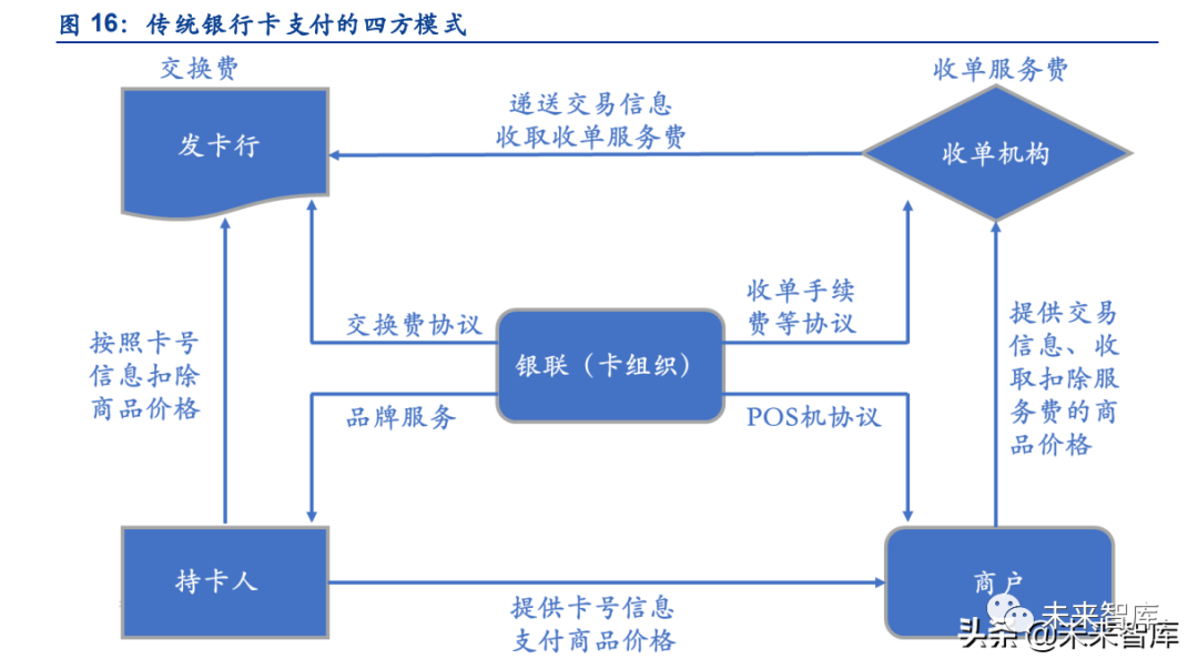 当前银行卡支付以四方模式为主。银行卡的清算模式经历了从二方、三方到四方模式的转变, 当前以四方模式为主。四方模式包含发卡行、卡组织、收单机构和商户。在四方模式下,商 户处理交易,而卡组织专门承担清算职能以及与之相关的标准制定、市场秩序维护等。资金 从发卡银行直接流向收单机构,因此做到了资金流、支付信息和交易的进一步分离。