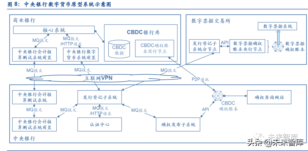 3)中央银行发行登记子系统生产发行数字人民币,并在确权账本进行权属登记。发行的数 字人民币通过中央银行数字货币系统前臵发送至商业银行核心系统后,存放在商业银行银行 库中。同时,发行登记子系统通知确权发布子系统数字人民币发行的权属信息,确权发布子 系统将脱敏后数据发布在数字人民币分布式确权账本上,数字人民币确权查询网站读取分布 式账本数据用于确权查询。商业银行的确权账本节点同步中央银行确权账本节点数据。(报告来源:未来智库)