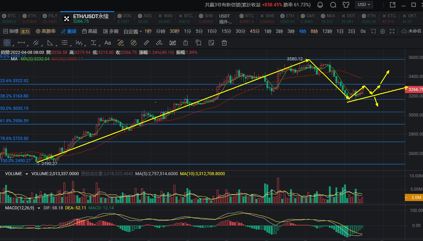 以太坊的走势要稍微强于大饼,昨天日线的表现反弹力度也是,跌的凶反弹的稳,短期内来看行情已经重新站稳了3200关口上方,其实以太此次的回落还是要比大饼温和很多,从此次阶段性性低点到高点来看的话,此次回落最终止跌位置是在斐波那契38.2%的关键位置附近,都没有触及30日均线附近,昨天也强调了,可能当日下跌的幅度比大饼要大,但是整体来说回落的空间还是在合理的范围,甚至比大饼要弱。截至目前来看,日线初步止跌,小时线上面开始有低点不断上移的一个走势出现,3200一线的支撑位置就是接下来需要重点关注的一个支撑了,小时线上面做个小级别的上行趋势线出来的话,你就会发现和强支撑位置3200关口重合了。因此对于以太来说,是否是阶段性回落需要关注的地方就是3200一线能否有效企稳了,现在说看涨那还为时尚早,但是作为小区间来说可以适当上移,关注3200-3320区间内行情突破情况是今天的主要思路,若是今天能再次上涨破位3280和3320的话,那么就可以初步确认是此次下跌为阶段性回落,后市有可能继续走高了。日内思路,回落3200一线做多,止损40点,目标看3280-3320,3320一线不破反手做空,止损带40点,目标看3200一线是否破位。