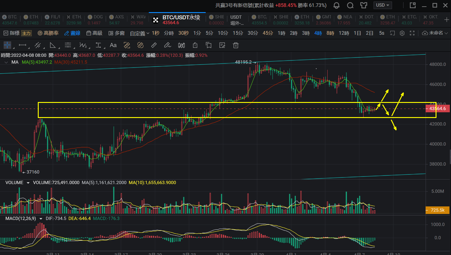 首先技术面来说,比特币的下方42600一线支撑位置经过了昨天一天的调整确认是有效的,但是上方的小级别压力位44200一线也没有升破,行情还是在这个区间内运行,那么交易上面也还是没有太大的变化,下方42600一线低点支撑位置不再破位的话,此次最终的下跌就是一个大级别上涨当中的阶段性回落休整,后市还有可能转头冲新高,而若是再次跌破42600一线支撑的话,就是一个趋势走坏,短期内行情转向空头。昨天说了,这里是一个三线重合的关键支撑位,斐波那契50%的回撤位置作为一个深度回落的终点位置非常合理,因此哪怕前面的日线下跌表现的那么强势,最终行情也是没有确认走出延续下跌,这本身就是一个止跌信号,这也是我们为什么昨天一再强调不要追空的原因。接下来行情只要不再次破位下方低点支撑的话,以此支撑位置去做多就是比较合理的时机和点位。当然还需要市场走出进一步确认就能出方向,也就是行情升破44200一线的小压力或许就可以作为一个方向信号。不过分的看多,也不盲目的追空,还是先关注日内区间的运行状态已经突破的方向。今天的思路,回落42600一线不破做多,止损400点,目标看44000-44200一线,破位持有,44200不破的话反手做空,止损400点,目标看42600一线能否跌破。