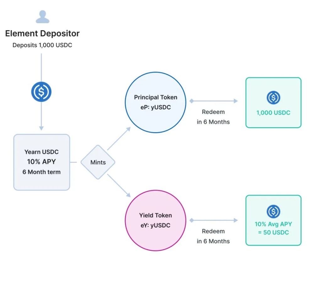 Element运作的大前提是把用户存入的资产(如ETH、BTC、USDC)拆分为基础代币(PT)和收益代币(YT)——基础代币可以赎回本金,收益代币可以赎回这些资产参与各种DeFi理财时所产生的收益,当然它是浮动的。