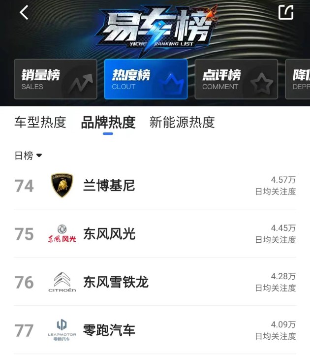 根据易车App“热度榜”显示的数据,兰博基尼排名第74位。如需更多数据,请到易车App查看。