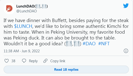 LunchDAO似乎已经志在必得,公开表明到时会请巴菲特食牛扒,还会带一些正宗泡菜(Kimchi )给他品尝,另外可能会透过用「午餐币」投票,看要带什么食物过去,到时说不定可能让股神品尝到北京填鸭呢。