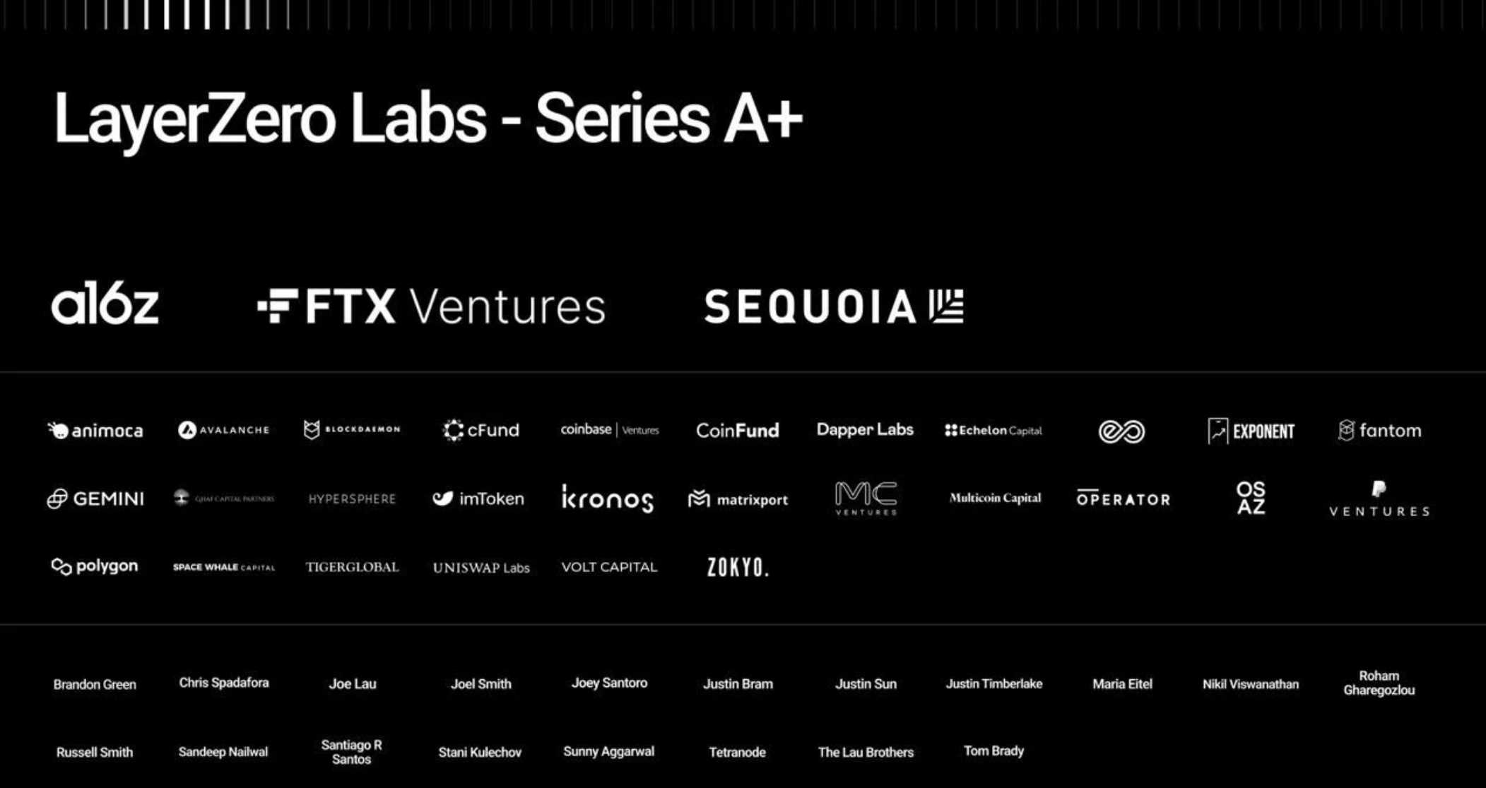 LayerZero 的开发团队 LayerZero Labs 宣布完成 1.35 亿美元 A+ 轮融资,本轮融资由 FTX Ventures、红杉资本与 a16z 共同领投,Coinbase Ventures、PayPal Ventures、Tiger Global 和 Uniswap Labs 等参投,投后估值为 10 亿美元。